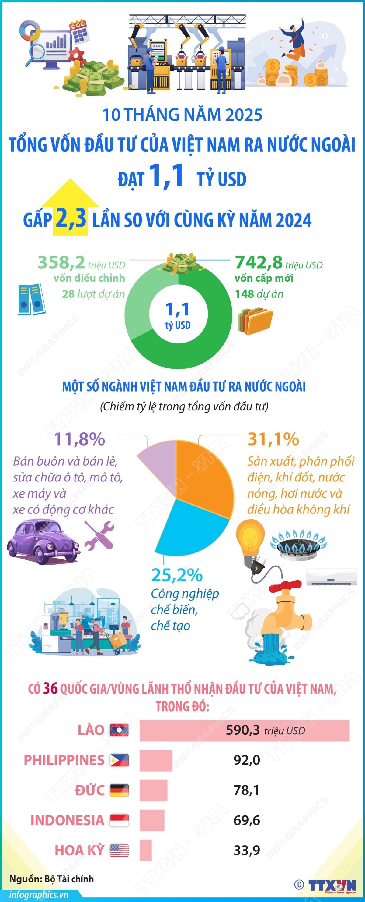 Hà Nội (TTXVN 9/11/2025) 10 tháng năm 2025, tổng vốn đầu tư của Việt Nam ra nước ngoài (vốn cấp mới và điều chỉnh) đạt 1,1 tỷ USD, gấp 2,3 lần so với cùng kỳ 2024. Cụ thể, trong 10 tháng năm 2025, có 148 dự án được cấp mới giấy chứng nhận đầu tư với tổng số vốn của phía Việt Nam là 742,8 triệu USD, tăng 72,8% so với cùng kỳ năm trước; có 28 lượt dự án điều chỉnh vốn với số vốn điều chỉnh tăng 358,2 triệu USD, gấp 8,3 lần.