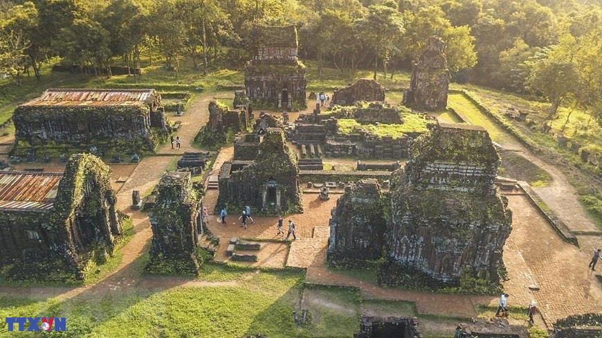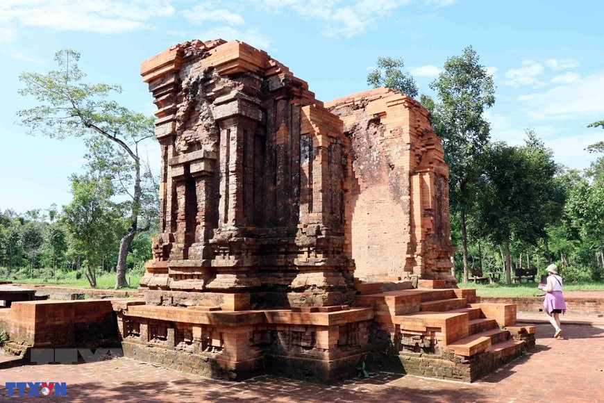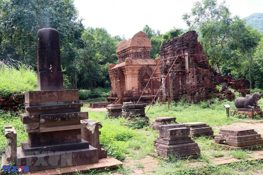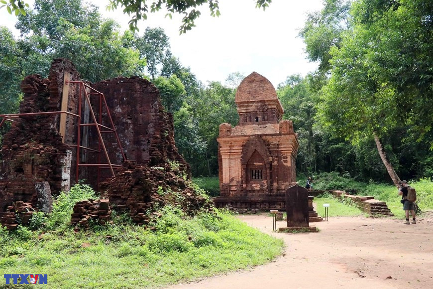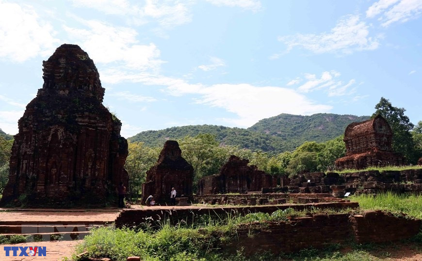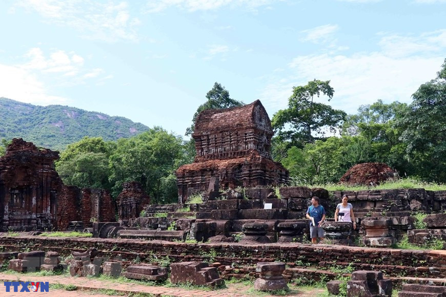 Khu di tích đền tháp Mỹ Sơn thuộc xã Duy Phú, huyện Duy Xuyên (tỉnh Quảng Nam) là một quần thể gồm nhiều đền đài Chăm Pa, nằm trong một thung lũng đường kính khoảng 2 km. Đây từng là nơi tổ chức nghi lễ cúng tế, là lăng mộ của các vị vua và hoàng thân, quốc thích Vương triều Chăm Pa trước đây. Tháng 12/1999, Khu di tích đền tháp Mỹ Sơn được UNESCO công nhận là Di sản Văn hóa Thế giới.(Ảnh: TTXVN)