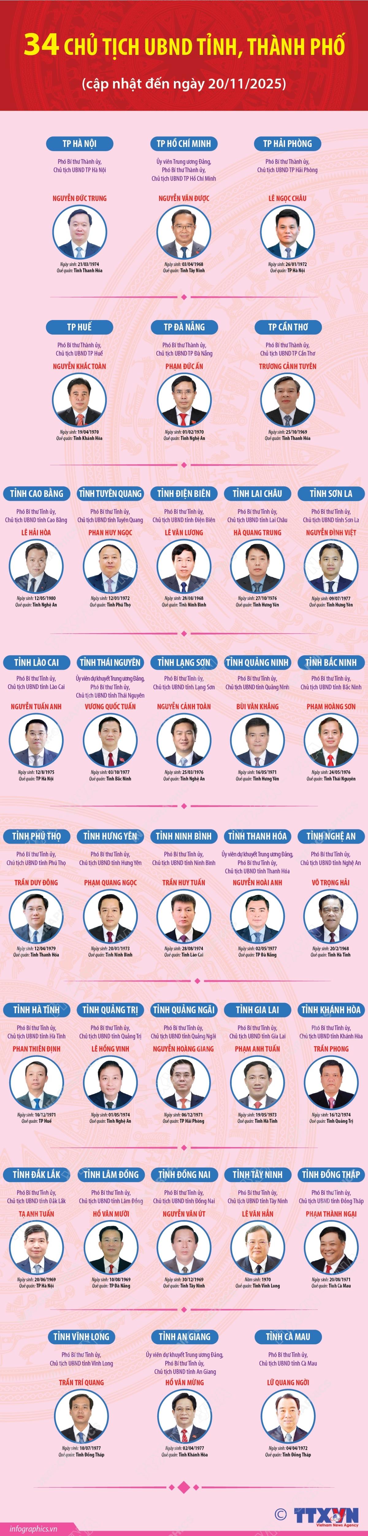 Hà Nội (TTXVN 20/11/2025) TTXVN trân trọng giới thiệu 34 Chủ tịch UBND tỉnh, thành phố nhiệm kỳ 2021-2026 (cập nhật đến ngày 20/11/2025)