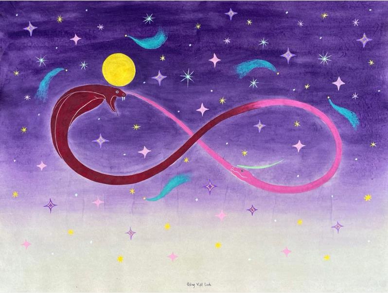 Trong khi đó, theo họa sĩ trẻ Đặng Việt Linh, năm rắn Ất Tỵ 2025 là năm đất nước có nhiều hi vọng mới, bước sang một kỷ nguyên nhiều thay đổi và vươn lên mạnh mẽ, anh gửi tâm tình, ước vọng cá nhân không ngại vượt qua giới hạn, thử thách để đến được với thành công. Chính vì thế, rắn trong tranh Đặng Việt Linh được tạo hình như một biểu tượng vô cực bay trên bầu trời đầy sao lấp lánh.