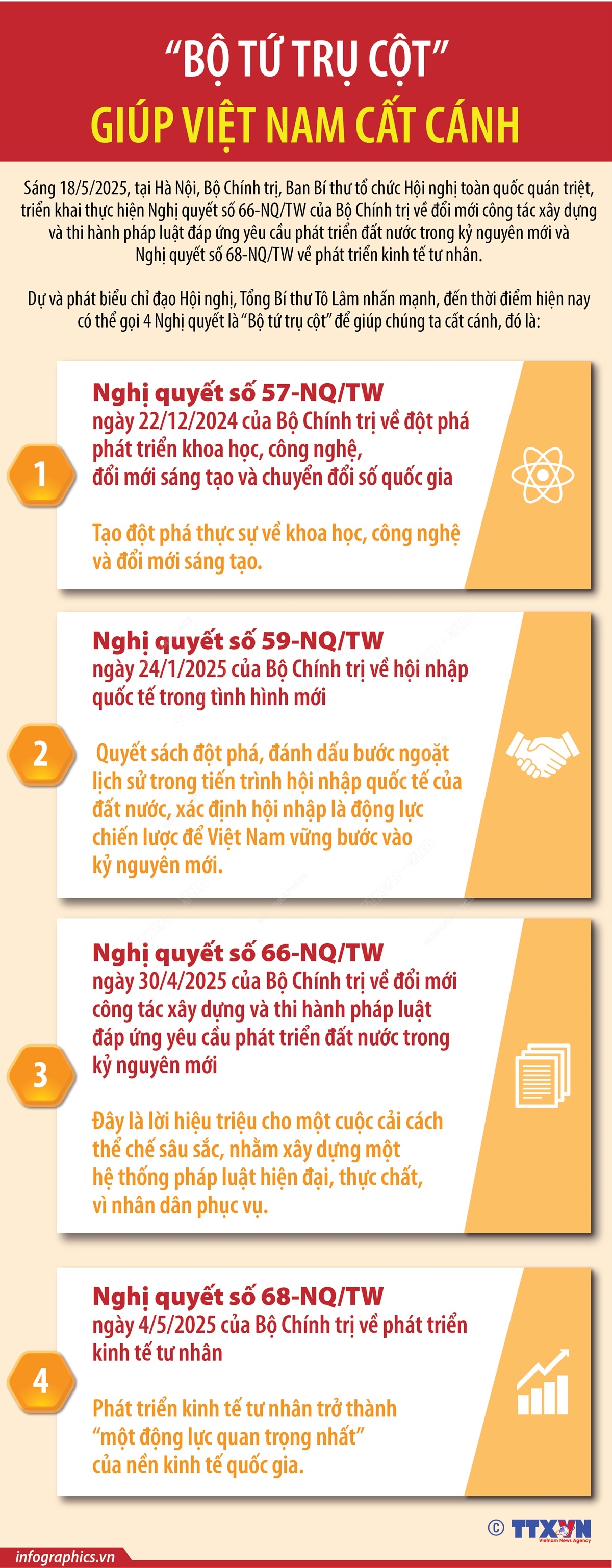 Hà Nội (TTXVN 21/5/2025) Phát biểu chỉ đạo tại hội nghị toàn quốc ngày 18/5/2025 về Nghị quyết số 66-NQ/TW và Nghị quyết số 68-NQ/TW, Tổng Bí thư Tô Lâm nhấn mạnh: Bốn Nghị quyết của Bộ Chính trị (Nghị quyết số 57-NQ/TW ngày 22/12/2024 về đột phá phát triển khoa học, công nghệ, đổi mới sáng tạo và chuyển đổi số quốc gia; Nghị quyết 59-NQ/TW ngày 24/1/2025 về hội nhập quốc tế trong tình hình mới; Nghị quyết số 68-NQ/TW ngày 4/5/2025 về phát triển kinh tế tư nhân; Nghị quyết số 66-NQ/TW về đổi mới công tác xây dựng và thi hành pháp luật đáp ứng yêu cầu phát triển đất nước trong kỷ nguyên mới) là “Bộ tứ trụ cột” giúp Việt Nam cất cánh.