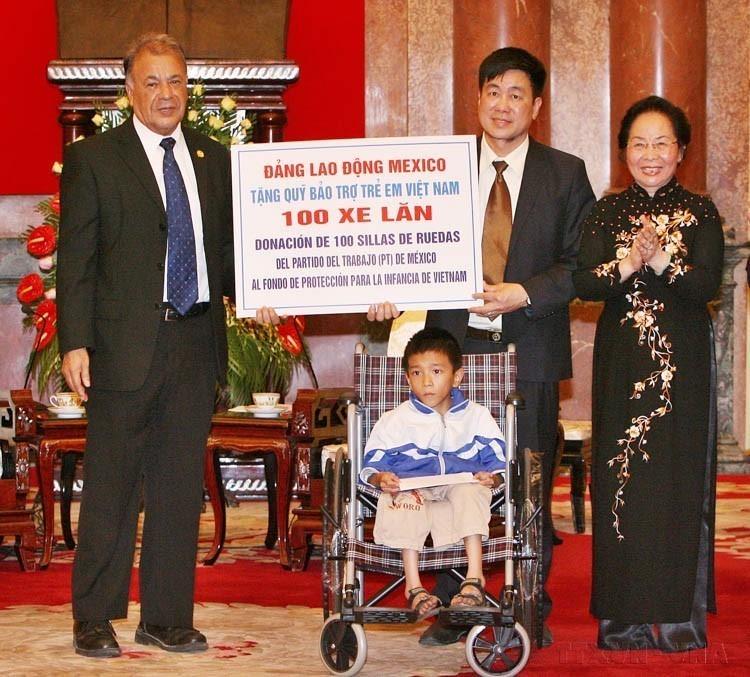 Tổng Bí thư Đảng Lao động Mexico (PT) Alberto Anaya Gutierrez, Trưởng đoàn Nghị sĩ PT tại Hạ viện Mexico, Chủ tịch Nhóm Nghị sỹ hữu nghị Mexico - Việt Nam tặng 100 chiếc xe lăn cho Quỹ bảo trợ trẻ em Việt Nam (8/5/2014). Ảnh: TTXVN