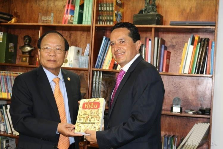 Bộ trưởng Bộ Văn hóa, Thể thao và Du lịch Hoàng Tuấn Anh trao tặng tác phẩm truyện Kiều cho Thứ trưởng Du lịch Mexico Carlos Joaquin (Mexico, 16/08/2015). Ảnh: Việt Hòa - TTXVN