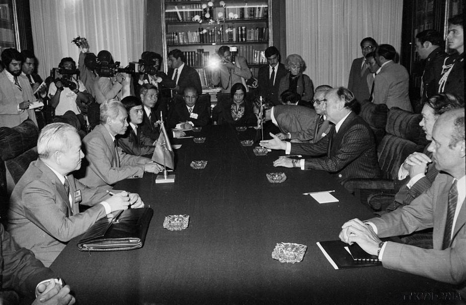 Tổng thống Mexico José López Portillo hội đàm với Thủ tướng Phạm Văn Đồng trong chuyến thăm Mexico từ ngày 12-13/9/1979. Ảnh: Xuân Lâm - TTXVN
