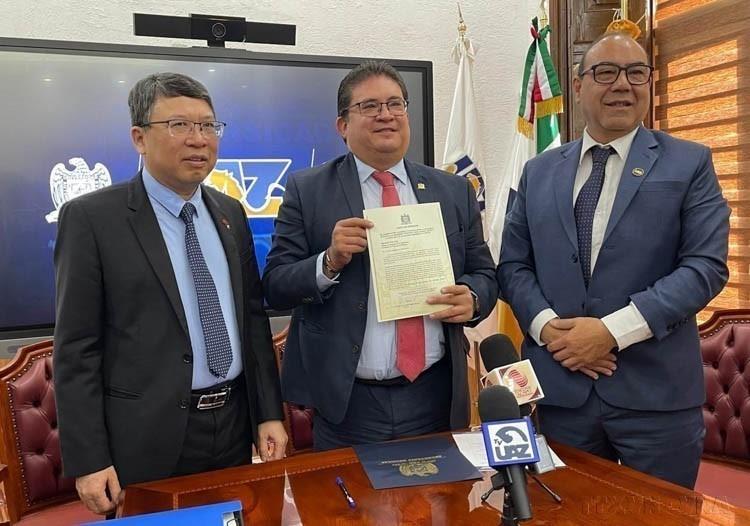 Đại sứ Việt Nam được bổ nhiệm tại Mexico Nguyễn Văn Hải cùng lãnh đạo Trường Đại học tự trị Zacatecas của Mexico sau lễ ký Biên bản ghi nhớ về hợp tác Giáo dục - Văn hóa giữa hai đơn vị (Mexico, 20/11/2024). Ảnh: Phi Hùng - TTXVN