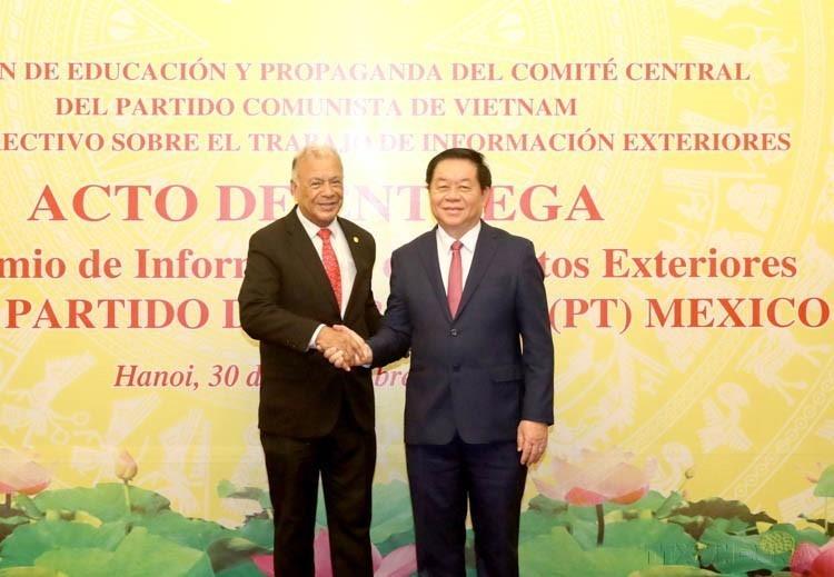 Bí thư Trung ương Đảng, Trưởng Ban Tuyên giáo Trung ương Nguyễn Trọng Nghĩa trao giải nhì Giải thưởng về thông tin đối ngoại lần thứ VIII cho Đảng Lao động Mexico (PT), ngày 30/11/2022. Ảnh: Phương Hoa - TTXVN