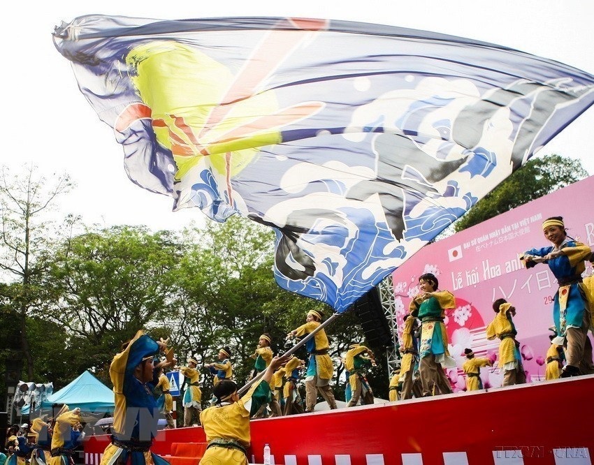 Màn trình diễn múa Yosakoi tại Lễ hội Hoa Anh đào Nhật Bản-Hà Nội 2019. (Ảnh: Thanh Tùng/TTXVN)