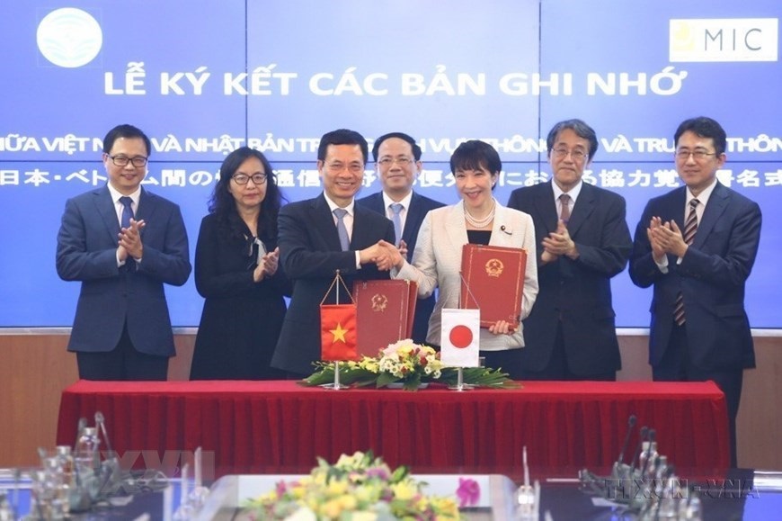 Bộ trưởng Bộ Thông tin và Truyền thông Nguyễn Mạnh Hùng và Bộ trưởng Bộ Nội vụ và Truyền thông Nhật Bản Sanae Takaichi trao đổi Biên bản ghi nhớ hợp tác (2020). (Ảnh: Minh Quyết/TTXVN)