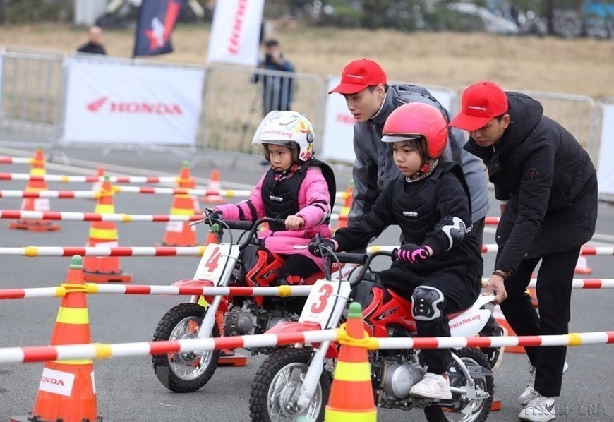 Trẻ em trải nghiệm Tay đua nhí trên xe địa hình tại chương trình Honda Thanks Day do Công ty Honda Việt Nam tổ chức (Hà Nội, 31/12/2022). (Ảnh: Hoàng Hiếu/TTXVN)