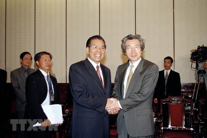 Thủ tướng Phan Văn Khải đón Thủ tướng Koizumi Junichiro thăm chính thức Việt Nam (Hà Nội, 27/4/2002). Trong chuyến thăm này, Việt Nam-Nhật Bản đã thiết lập quan hệ Đối tác Tin cậy, Ổn định Lâu dài. (Ảnh: TTXVN)