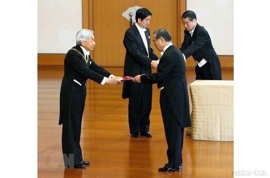 Nhà vua Nhật Bản Akihito (trái) trao tặng Huân chương Mặt trời Mọc cho nguyên Thủ tướng Phan Văn Khải (Tokyo, 7/11/2006). (Ảnh: Kyodo)