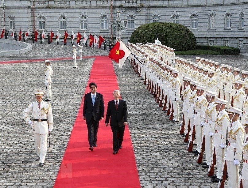 Thủ tướng Shinzo Abe chủ trì Lễ đón Tổng Bí thư Nguyễn Phú Trọng thăm chính thức Nhật Bản từ ngày 15-18/9/2015. (Ảnh: Trí Dũng/TTXVN)