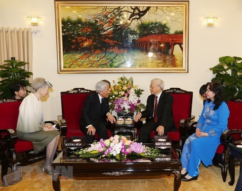 Tổng Bí thư Nguyễn Phú Trọng và Phu nhân hội kiến Nhà vua Nhật Bản Akihito và Hoàng hậu Michiko thăm chính thức Việt Nam (3/3/2017). (Ảnh: Trí Dũng/TTXVN)