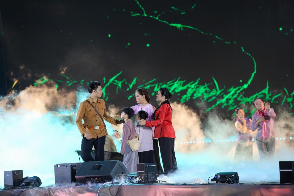 Hoạt cảnh được dàn dựng sinh động, giàu cảm xúc, khơi dậy tinh thần yêu nước mãnh liệt cùng ý chí sẵn sàng hy sinh lợi ích cá nhân, gia đình vì độc lập, tự do của Tổ quốc (19/4/2025). Ảnh: Giang Phương - TTXVN