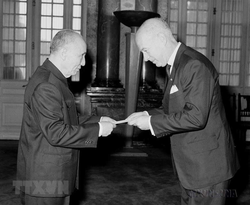 Đại sứ đặc mệnh toàn quyền Vương quốc Hà Lan tại Việt Nam Jan Vixseboxse (bên phải) trình Quốc thư lên Phó Chủ tịch nước Nguyễn Lương Bằng (Hà Nội, 13/12/1974). (Ảnh: Thế Trung/TTXVN)