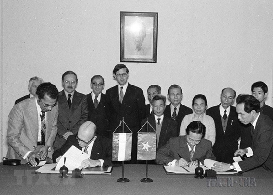 Thứ trưởng Bộ Ngoại giao Phan Hiển và ông John Mann, Tổng vụ phó Vụ Hợp tác Kinh tế Bộ Ngoại giao Hà Lan thay mặt 2 chính phủ ký văn kiện hợp tác kinh tế Việt Nam-Hà Lan (Hà Nội, 15/12/1976). (Ảnh: Thế Trung/TTXVN)