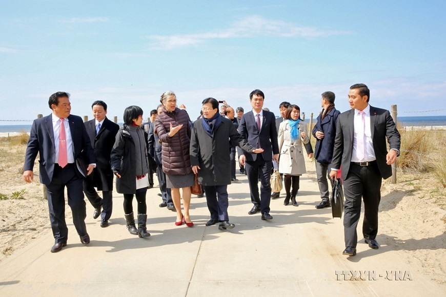 Trong làm việc và đồng chủ trì Phiên họp lần thứ 6 Ủy ban liên Chính phủ Hà Lan-Việt Nam về thích ứng với biến đổi khí hậu và quản lý nước, ngày 20/4/2017, Phó Thủ tướng Trịnh Đình Dũng đến thăm công trình Sand Engine (Động cơ cát), một thành tựu nổi bật về cải tạo thiên nhiên của Hà Lan. (Ảnh: Phạm Văn Thắng/TTXVN)