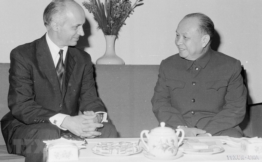 Chủ tịch Ủy ban Thường vụ Quốc hội Trường Chinh tiếp thân mật Đại sứ Hà Lan tại Việt Nam, Tiến sỹ John Dobermann (Hà Nội, 24/2/1977). (Ảnh: Xuân Lâm/TTXVN)