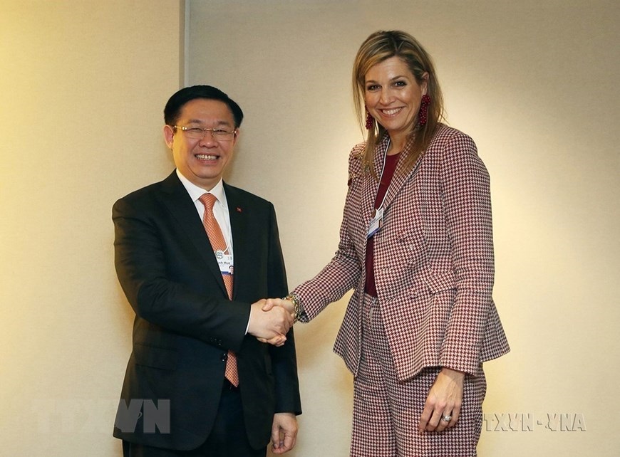Phó Thủ tướng Vương Đình Huệ chào xã giao Hoàng hậu Hà Lan Maxima trong chuyến tham dự Hội nghị thường niên Diễn đàn Kinh tế Thế giới (WEF) tại Davos, Thụy Sĩ, chiều 24/1/2018. (Ảnh: Hoàng Hoa/TTXVN)