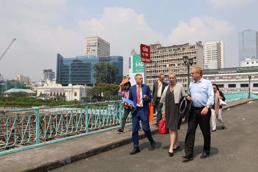 Bộ trưởng Kinh tế Đối ngoại và Hợp tác Phát triển Hà Lan Sigrid Kaag cùng đoàn doanh nghiệp đi khảo sát về quản lý nước, môi trường trên kênh kênh Tẻ và khu vực Cầu Mống (TP Hồ Chí Minh, 7/2/2018). (Ảnh: Thanh Vũ/TTXVN)