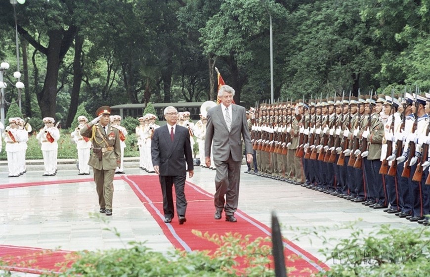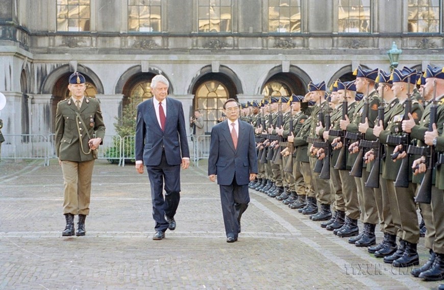 Thủ tướng Võ Văn Kiệt chủ trì Lễ đón Thủ tướng Hà Lan Wim Kok thăm chính thức Việt Nam (Hà Nội, 12/6/1995). (Ảnh: Minh Điền/TTXVN)