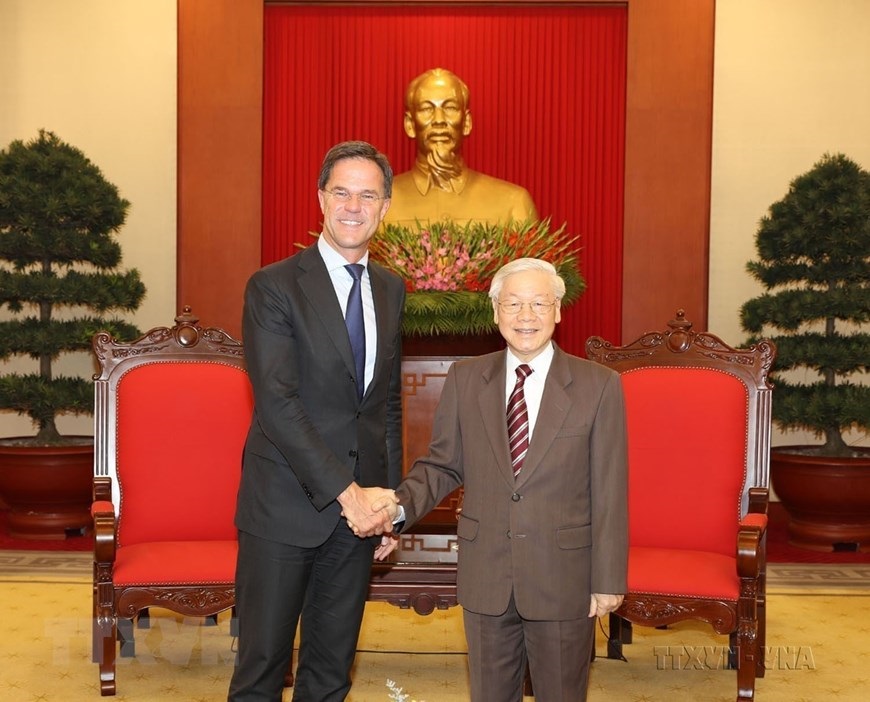 Tổng Bí thư, Chủ tịch nước Nguyễn Phú Trọng tiếp Thủ tướng Hà Lan Mark Rutte thăm chính thức Việt Nam (Hà Nội, 9/4/2019). (Ảnh: Trí Dũng/TTXVN)