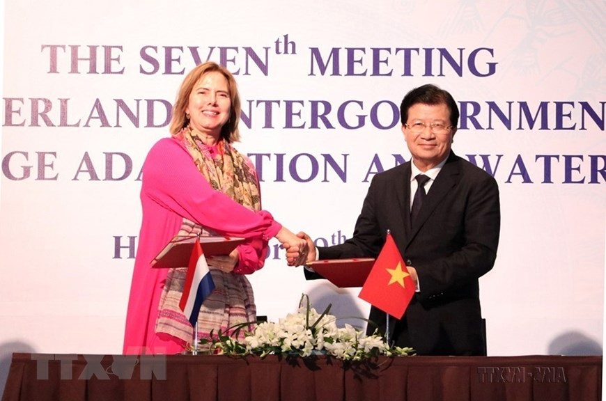 Phó Thủ tướng Trịnh Đình Dũng và Bộ trưởng Bộ Cơ sở hạ tầng và Quản lý nước Hà Lan Cora van Nieuwenhuizen ký Biên bản Phiên họp lần thứ VII Ủy ban liên Chính phủ Việt Nam-Hà Lan về thích ứng với biến đổi khí hậu và quản lý nước (Hà Nội, 9/4/2019). (Ảnh: Văn Điệp/TTXVN)