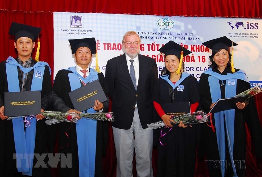 Giáo sư-Tiến sỹ Karel Jansen, Viện Khoa học xã hội Hà Lan, trao bằng tốt nghiệp cho các tân thạc sỹ khosa 10-11 của Chương trình hợp tác đào tạo cao học kinh tế Việt Nam-Hà Lan (Hà Nội, 4/12/2008). (Ảnh: Bích Ngọc/TTXVN)