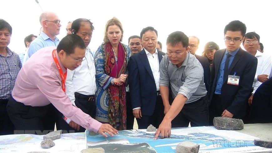 Bộ trưởng Bộ Cơ sở hạ tầng và Quản lý Hà Lan Cornelia Van Nieuwen Huizen và các chuyên gia Hà Lan đến Cửa Đại, thành phố Hội An (tỉnh Quảng Nam) khảo sát, tìm hiểu tình hình sạt lở bờ biển Hội An, để tìm giải pháp khắc phục (10/4/2019). (Ảnh: Đoàn Hữu Trung/TTXVN)