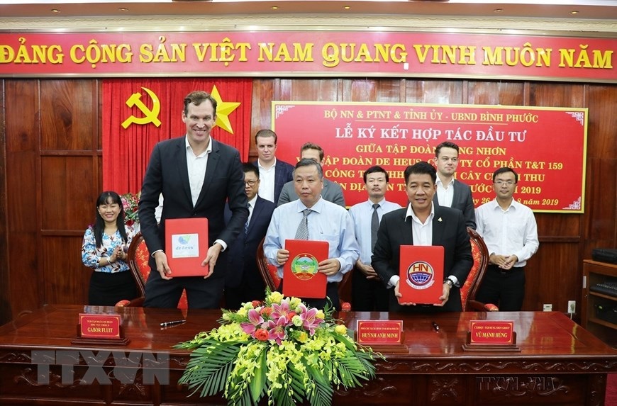 Ký kết dự án “Xây dựng khu chăn nuôi gà thịt xuất khẩu chất lượng cao Bình Phước” do Công ty TNHH De Heus (Hà Lan) liên doanh với Tập đoàn Hùng Nhơn làm chủ đầu tư, tại Bình Phước, ngày 26/8/2019. (Ảnh: Dương Chí Tưởng/TTXVN)