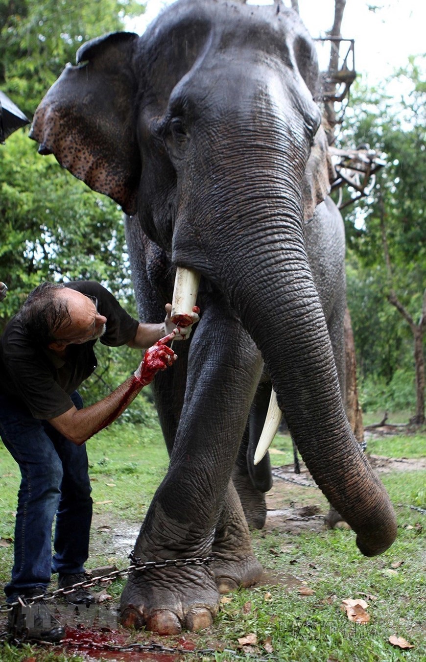 Chuyên gia của Vườn thú Rotterdam (Hà Lan) phẫu thuật cắt ngà bị thương để điều trị cho voi Thoong Ngân tại Vườn quốc gia Yok Đôn (Đắk Lắk, 16/7/2015). (Ảnh: Dương Giang/TTXVN)
