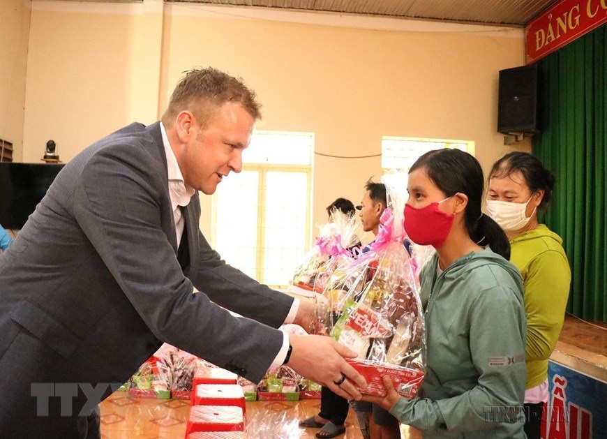Đại diện Tập đoàn De Heus (Hà Lan) trao tặng 100 suất quà Tết cho người dân có hoàn cảnh khó khăn, các hộ đồng bào dân tộc thiểu số trên địa bàn xã vùng sâu Ea M’Droh, huyện Cư M’gar, tỉnh Đắk Lắk (27/12/2022). (Ảnh: Tuấn Anh/TTXVN)