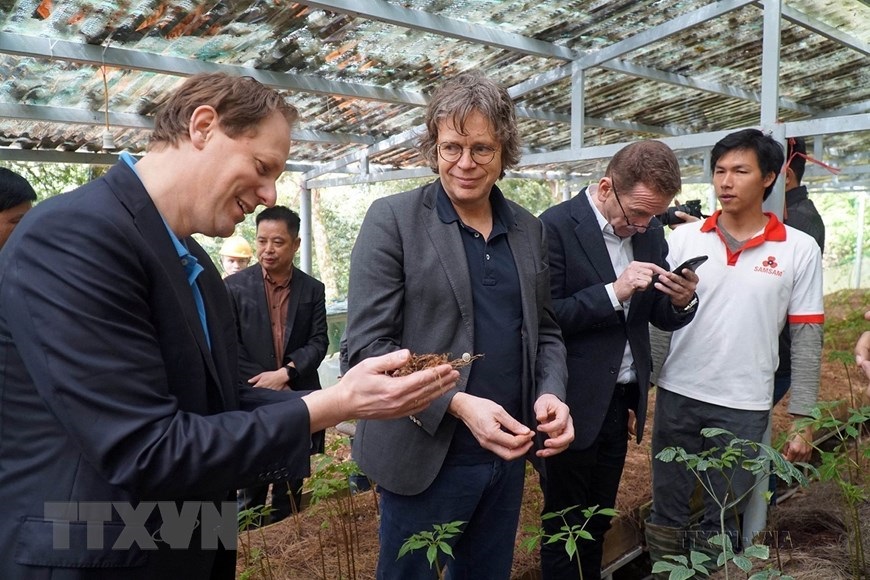 Chuyên gia Quỹ khí hậu và phát triển triển Hà Lan và WWF Việt Nam khảo sát thực tế vườn sâm của Công ty Sâm Sâm Group tại xã Trà Linh, huyện Nam Trà My tỉnh Quảng Nam (27/2/2023). (Ảnh: Trần Tĩnh/TTXVN)