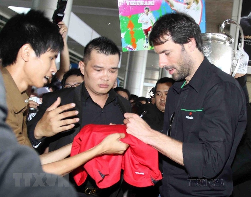Cựu danh thủ Đội tuyển bóng đá Hà Lan Ruud Van Nistelrooy lưu bút trên áo tặng người hâm mộ Việt Nam trong chuyến đi cùng chiếc cúp C1 châu Âu đến Thành phố Hồ Chí Minh của Chương trình "Đường đến chung kết" (Road To Final), ngày 3/4/2014. (Ảnh: Quang Nhựt/TTXVN)
