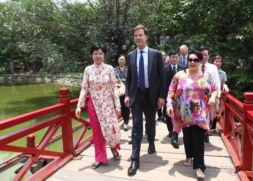 Trong chuyến thăm chính thức Việt Nam, sáng 16/6/2014, Thủ tướng Vương quốc Hà Lan Mark Rutte đến thăm Hồ Hoàn Kiếm và Đền Ngọc Sơn. (Ảnh: Doãn Tấn/TTXVN)