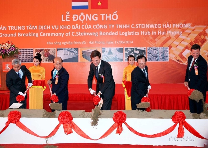 Thủ tướng Hà Lan Mark Rutte làm lễ động thổ Dự án Trung tâm dịch vụ kho bãi của Công ty TNHH C. Steinweng (FE) Pte ở Hải Phòng, chiều 17/6/2014. (Ảnh: Phạm Kiên/TTXVN)