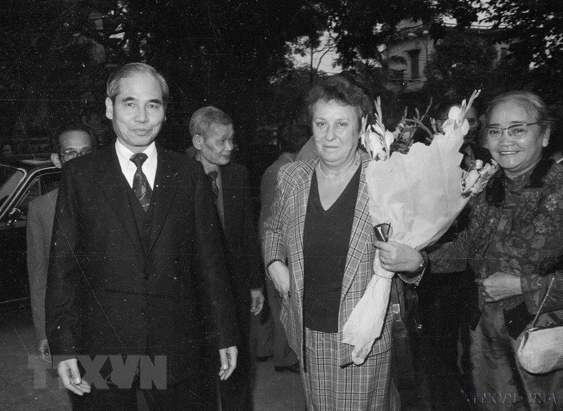 Ông Nguyễn Đức Tâm, Ủy viên Bộ Chính trị, Bí thư Trung ương Đảng đón bà Giglia Tedesco Tatò, Ủy viên Ban lãnh đạo Đảng Cộng sản Italy, Phó Chủ tịch Thượng viện Italy sang thăm Việt Nam, ngày 12/2/1985. (Ảnh: Xuân Lâm/TTXVN)