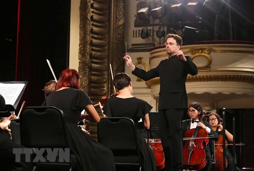Nhạc trưởng Oliver Ochanine chỉ huy dàn nhạc tại buổi hoà nhạc “Gioacchino Rossini Gala Concert” kỷ niệm 72 năm Quốc khánh Italy và 45 năm thiết lập quan hệ ngoại giao Italy-Việt Nam, ngày 4/6/201. (Ảnh: Thành Đạt/TTXVN)