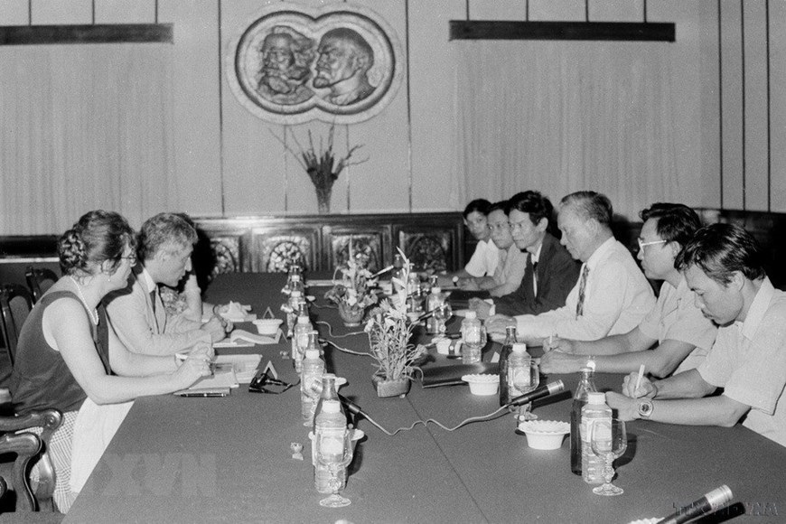 Ông Lê Đức Anh, Ủy viên Bộ Chính trị, Bí thư Trung ương Đảng hội đàm với ông Antonio Bassolino, Ủy viên Ban lãnh đạo, Ủy viên Ban phối hợp chính trị Trung ương Đảng Dân chủ cánh tả Italy, ngày 16/7/1992. (Ảnh: Kim Hùng/TTXVN)