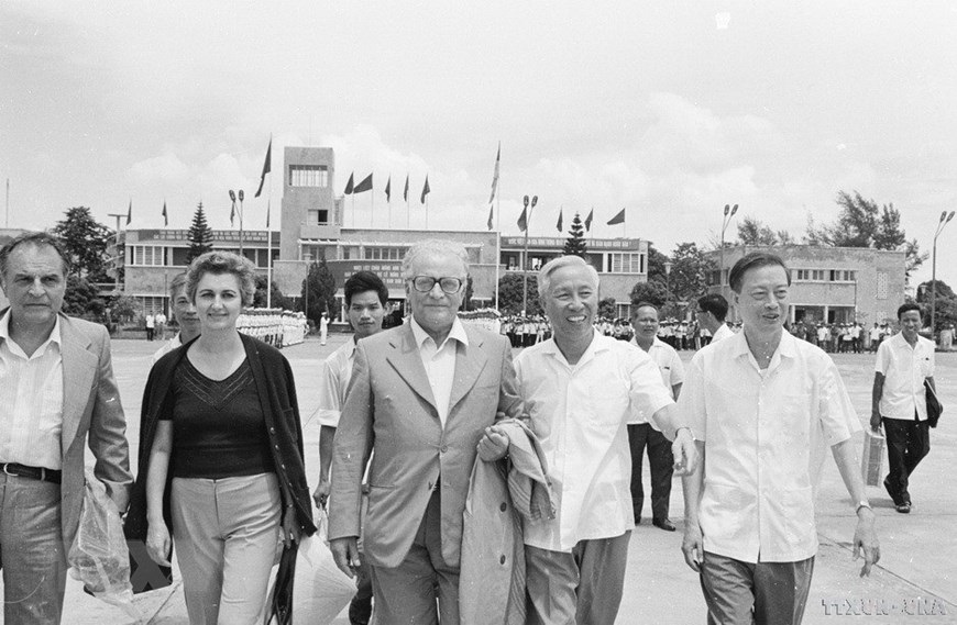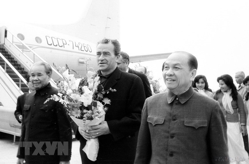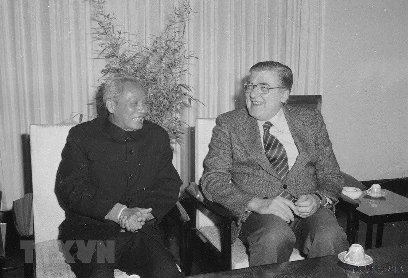 Ông Lê Đức thọ, Ủy viên Bộ Chính trị tiễn Đoàn đại biểu Đảng Cộng sản Italy do ông Paolo Bufalini, Ủy viên Ban Lãnh đạo và Ban Bí thư Trung ương Đảng Cộng sản Italy làm trưởng đoàn sang dự Lễ kỷ niệm 30 năm Ngày thành lập nước Việt Nam Dân chủ cộng hòa, ngày 6/9/1975. (Ảnh: TTXVN)