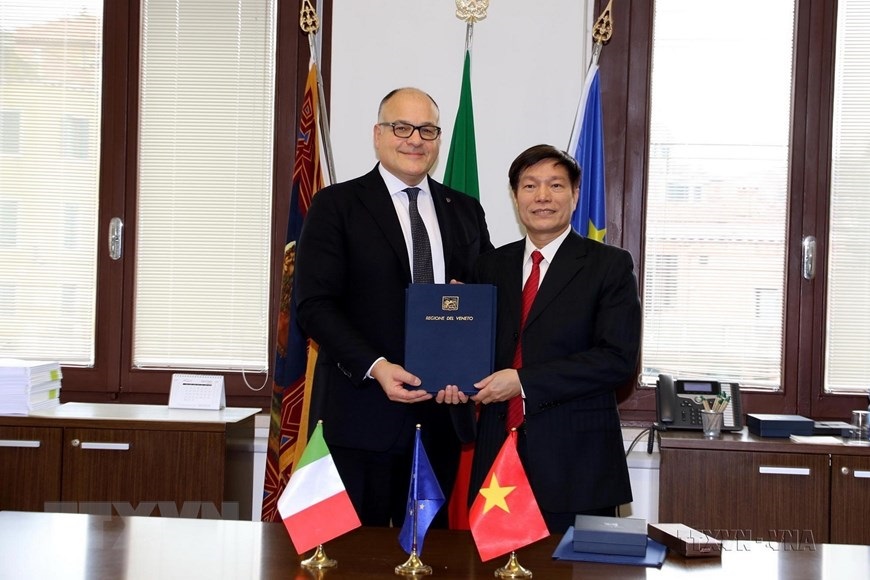 Ông Diego Vecchiato, Quan chức phụ trách đối ngoại vùng Veneto trao Bản ghi nhớ về thiết lập quan hệ hữu nghị và hợp tác giữa tỉnh Bà Rịa-Vũng Tàu với Vùng Veneto (Italy) cho Tham tán Thương mại Việt Nam tại Italy Nguyễn Đức Thanh, ngày 26/1/2018. (Ảnh: Nguyễn Thanh Bình/TTXVN)