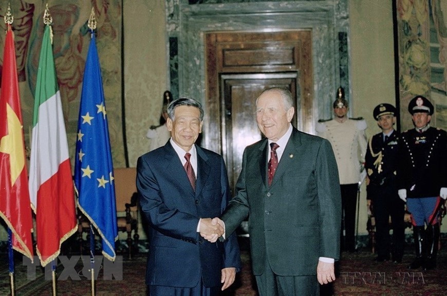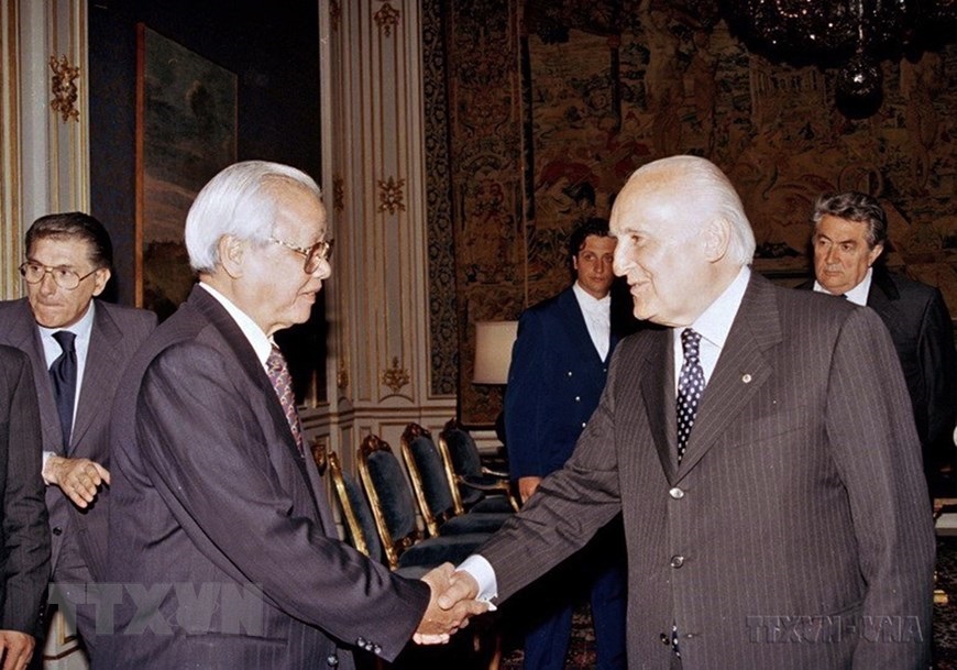 Thủ tướng Võ Văn Kiệt gặp Tổng thống Oscar Luigi Scalfaro trong chuyến thăm chính thức Italy, sáng 26/5/1997. (Ảnh: Minh Đạo/TTXVN)