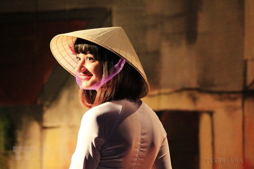Thiếu nữ Italy duyên dáng trong tà áo dài và chiếc nón lá truyền thống Việt Nam tại chương trình trình diễn áo dài, nón “Bài thơ” tại Liên hoan Sinh viên Việt Nam 2018 ở Italy, ngày 9/5/2018. (Ảnh: Quang Thanh/TTXVN)