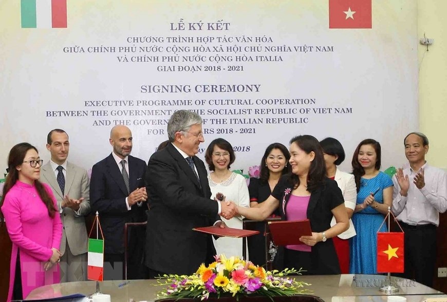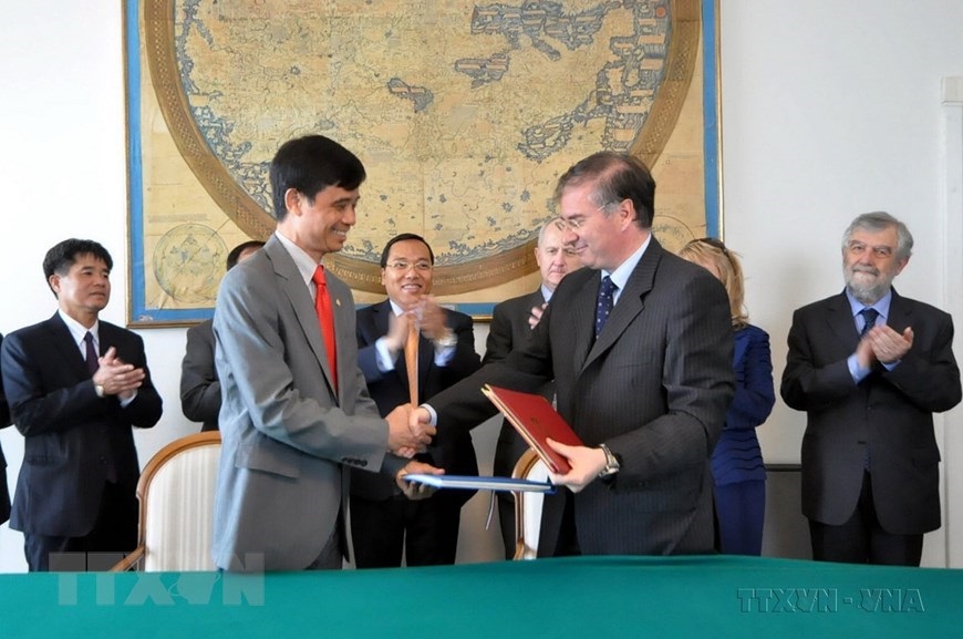 Thứ trưởng Bộ Giáo dục và Đào tại Nguyễn Văn Phúc và Đại sứ Italy tại Việt Nam Antonion Alessandro ký Chương trình hành động về hợp tác giáo dục giữa hai nước giai đoạn 2019-2022, ngày 6/6/2019. (Ảnh: Doãn Tấn/TTXVN)