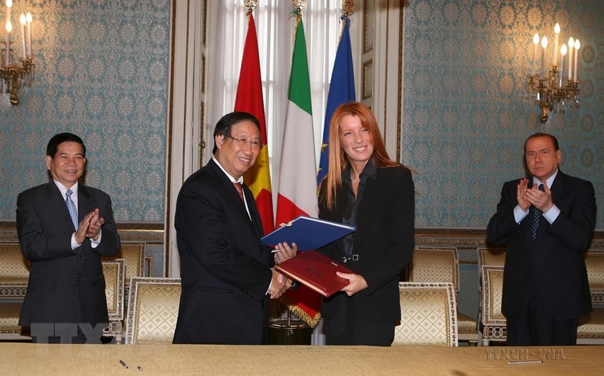 Thủ tướng Italy Silvio Belusconi và Chủ tịch nước Nguyễn Minh Triết chứng kiến lễ ký Hiệp định giữa Chính phủ hai nước về hợp tác trong lĩnh vực du lịch, ngày 12/12/2009. Ảnh: Nguyễn Khang - TTXVN