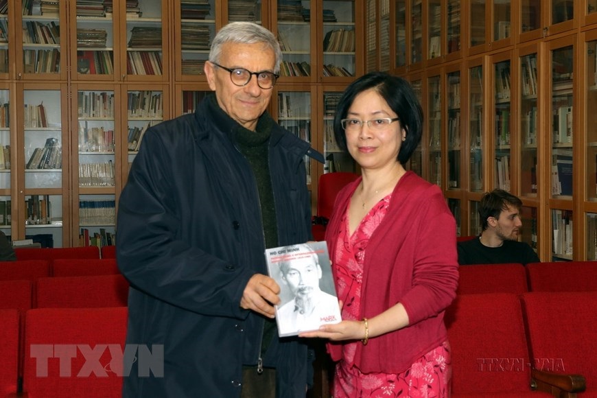 Dịch giả Italy Andrea Catone tặng cuốn sách “Hồ Chí Minh-Chủ nghĩa yêu nước và Chủ nghĩa quốc tế” cho Đại sứ Nguyễn Thị Bích Huệ tại buổi giới thiệu sách ở Rome, ngày 12/4/2019. (Ảnh: Ngự Bình/TTXVN)
