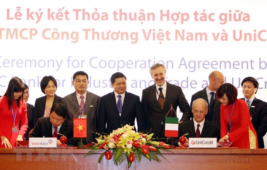 Lễ ký kết Thỏa thuận hợp tác giữa Ngân hàng TMCP Công Thương Việt Nam (ViettinBank) và Ngân hàng UniCredit S.p.A của Italy, Hà Nội, 5/5/2011. (Ảnh: TTXVN)