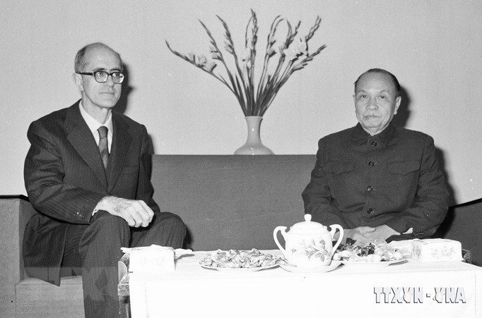 Chủ tịch Ủy ban thường vụ Quốc hội Trường Chinh tiếp Đại sứ Cộng hòa Italy tại Việt Nam Giuliano Bertuccioli, ngày 30/12/1975. (Ảnh: Thế Trung/TTXVN)