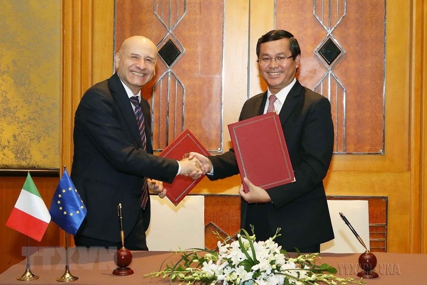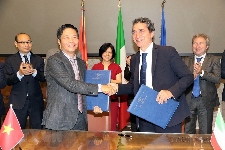 Bộ trưởng Trần Tuấn Anh và Thứ trưởng Andrea Cioffi ký Biên bản ghi nhớ giữa Bộ Công Thương Việt Nam và Bộ Phát triển kinh tế Italy về hợp tác trong lĩnh vực năng lượng, ngày 20/6/2019. (Ảnh: Hải Linh/TTXVN)