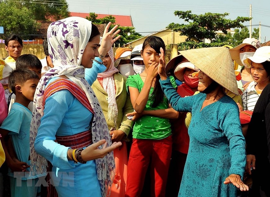 Nữ du khách Italy làm quen với điệu múa Chăm trong Lễ hội Katê của đồng bào Chăm theo đạo Bà La Môn tỉnh Ninh Thuận, ngày 15/10/2012. (Ảnh: Thanh Hà/TTXVN)